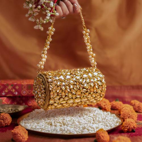 - KUNDAN WORK BRIDAL CLUTCH IN GOLD WITH MAGNETIC BUTTON CLOSURE. ,SLING INCLUDED