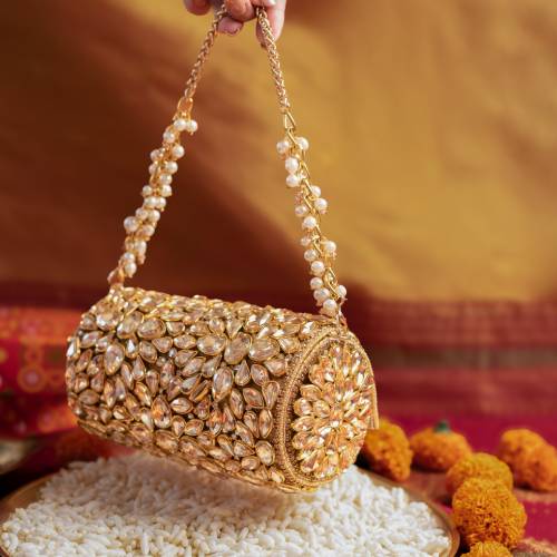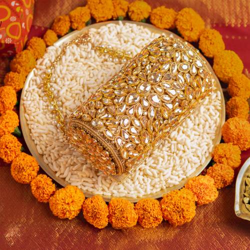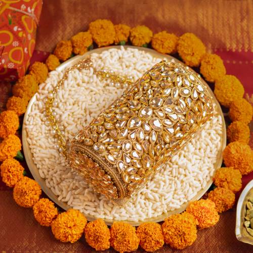 - KUNDAN WORK BRIDAL CLUTCH IN GOLD WITH MAGNETIC BUTTON CLOSURE. ,SLING INCLUDED