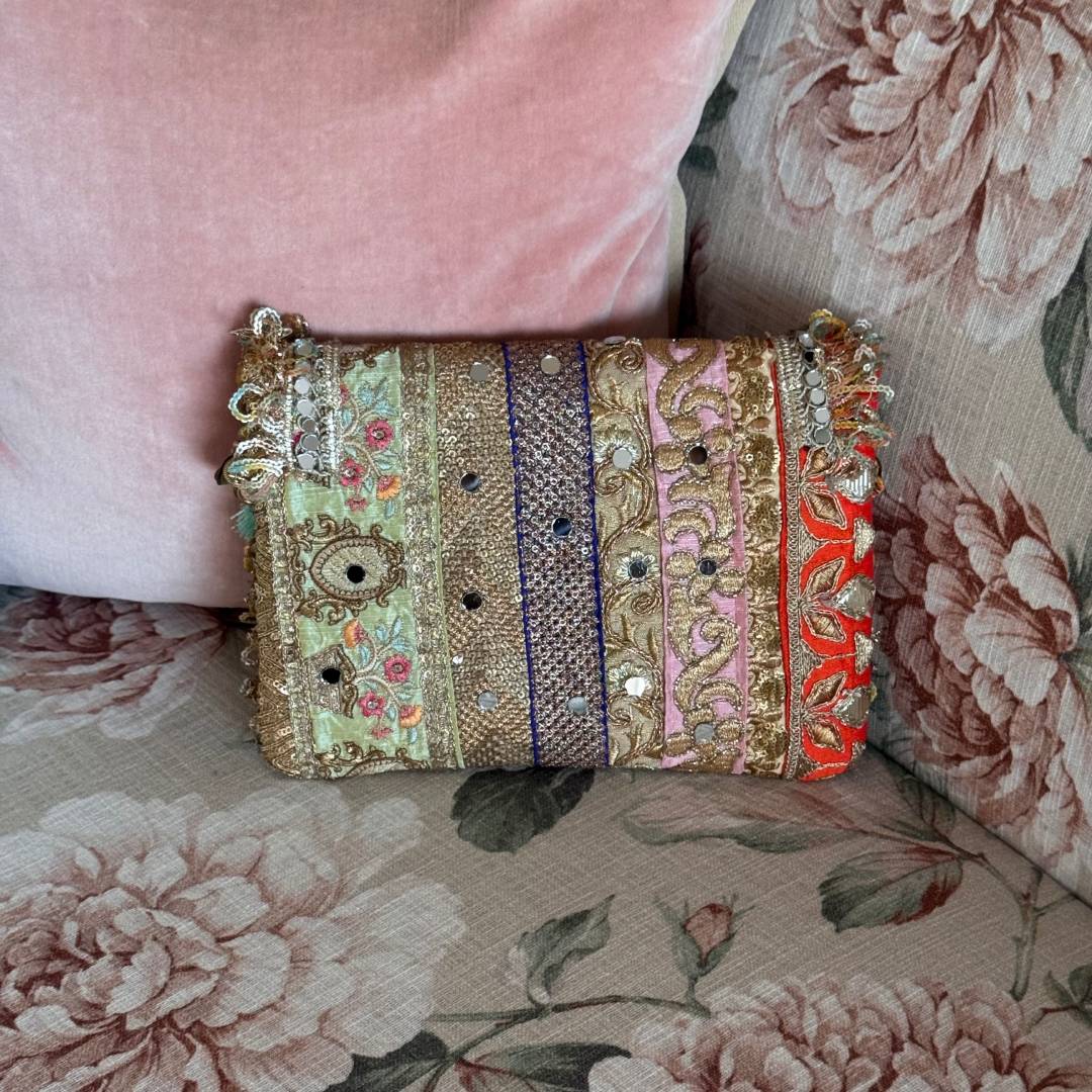 BEAUTIFUL, SPACIOUS PATCHWORK CLUTCH IN MIXED COLORS TO GO WITH EVERY OUTFIT. COMES WITH A CROSSBODY SLING.