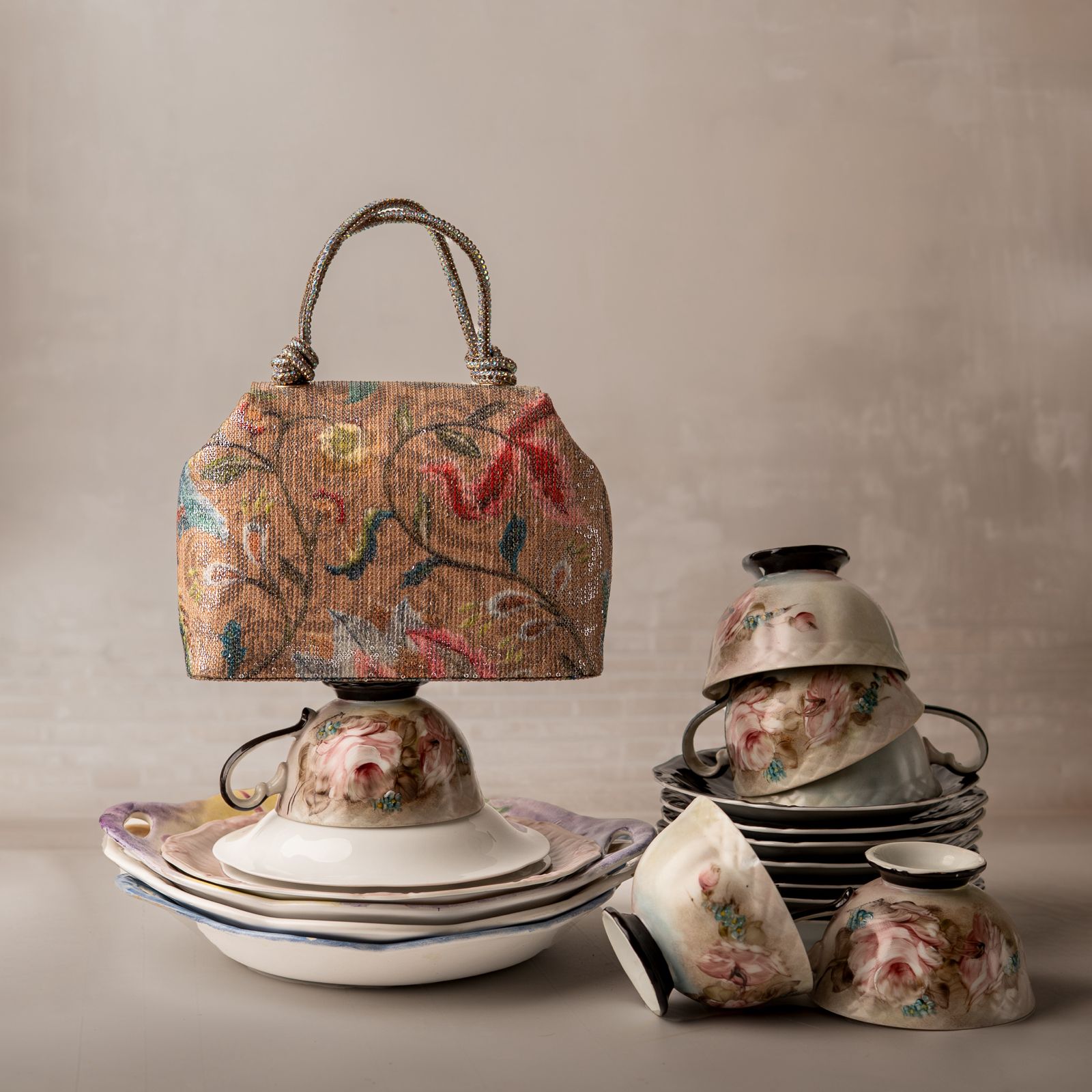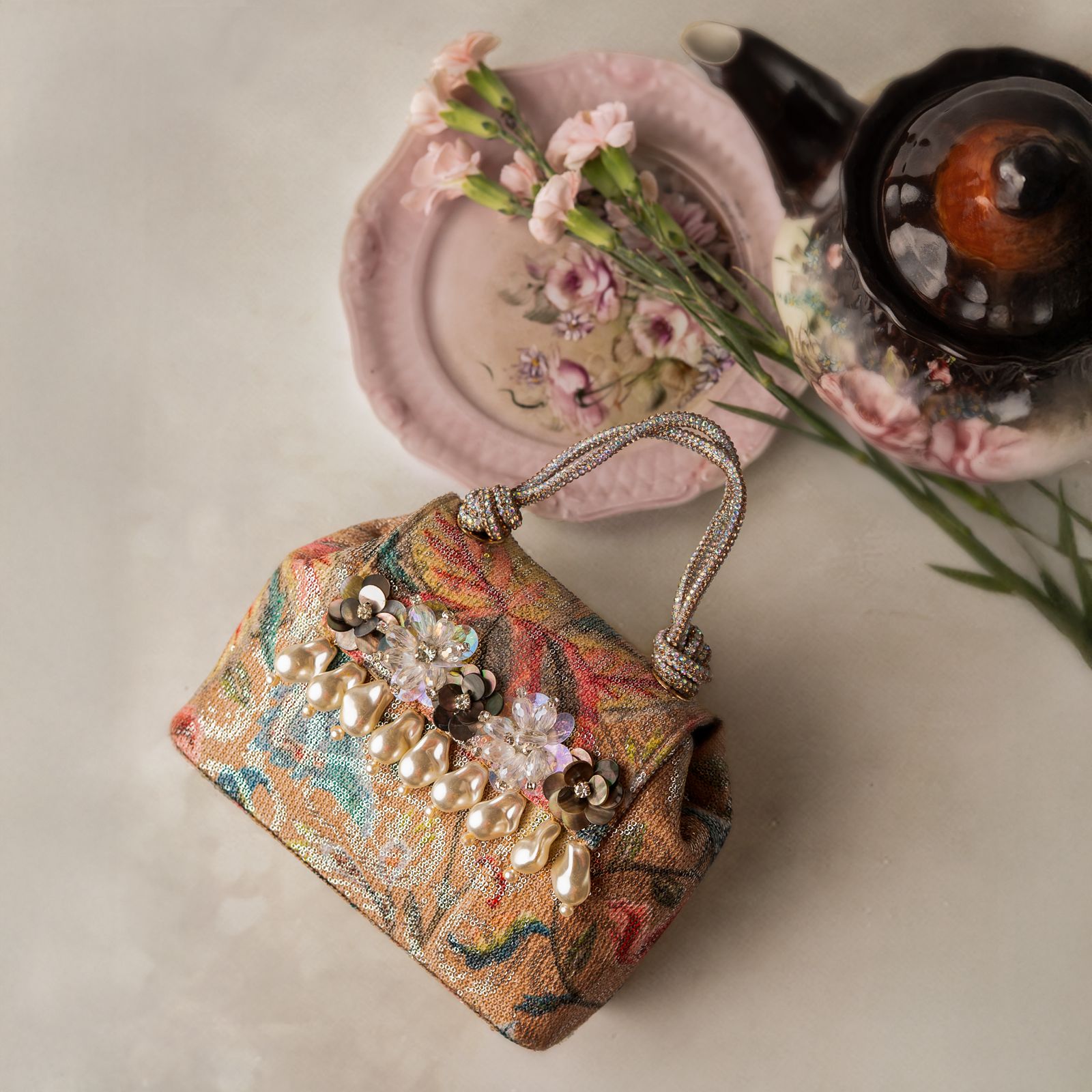 - SMALL TOTE BAG THAT FITS IN ALL YOUR ESSENTIALS -PHONES/MONEY/CARDS /KEYS.DIGITALLY PRINTED SEQUINS AND PEARLS MAKE AN UNUSUAL COMBO THATS PERFECT FOR BRUNCH TO BAR NIGHTS